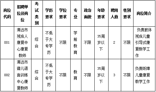清遠市殘疾人康復中心、清遠市聾兒語言訓練中心,是市殘聯直屬公益一類事業(yè)單位,是專門為0-6歲殘障兒童康復的機構。根據工作需要招聘康復教師5名(屬非編制人員,不列入用人單位編制序列,不擔任行政職務),現將有關事項公告如下: