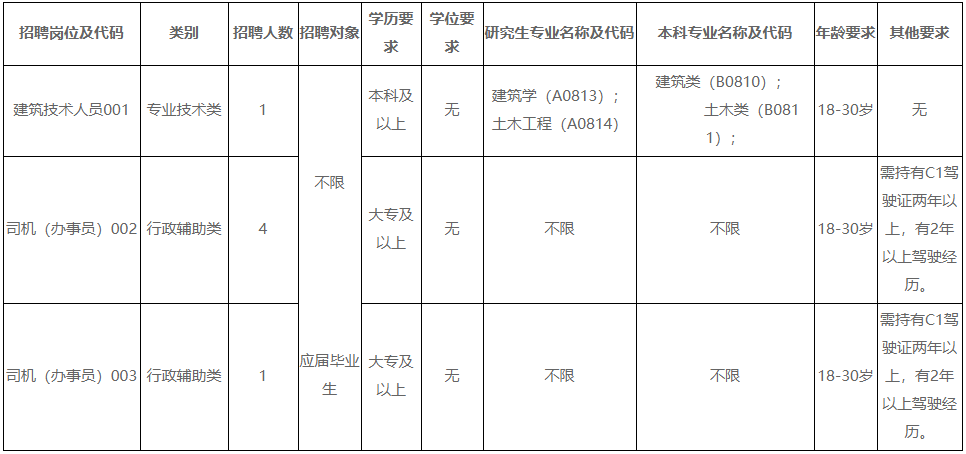1.崗位為建筑技術(shù)人員,崗位代碼001,招聘對象為普通高等院校2022年應(yīng)屆畢業(yè)生和社會上具有國家承認(rèn)學(xué)歷的大學(xué)本科畢業(yè)以上人員。