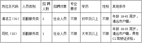 清遠(yuǎn)市清城區(qū)機(jī)關(guān)事務(wù)管理局因工作需要,根據(jù)《關(guān)于印發(fā)<清遠(yuǎn)市清城區(qū)機(jī)關(guān)事業(yè)單位專項工作聘員、合同制聘員以及后勤服務(wù)類人員管理辦法>的通知》(城區(qū)人社〔2022〕20號)文件精神,面向社會公開招聘后勤服務(wù)類人員3名,現(xiàn)將有關(guān)事宜公告如下: