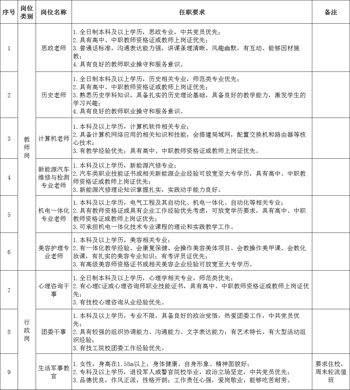 4、教師崗需本科及以上學(xué)歷,碩士優(yōu)先;文化課教師需持有相應(yīng)的教資;專業(yè)課教師持有相應(yīng)技能證書/職稱或相應(yīng)行業(yè)經(jīng)驗優(yōu)先錄用。